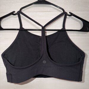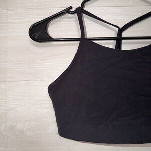 Stay supported in style with this sleek Stori black strappy back sports bra in a size small. Crafted from soft, stretchy performance fabric, it features a high neckline for secure coverage and a minimalist open-back design with double straps that offer both comfort and breathability. Perfect for yoga, pilates, or casual athleisure looks, this versatile black bra pairs easily with leggings or shorts for a clean, polished fit.