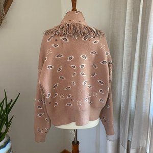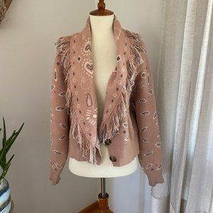 Fun and funky desert cardigan, with freeform paisley patterns and contrast knit lining.