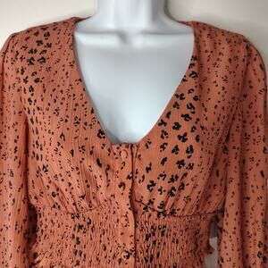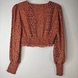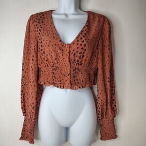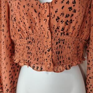 Storia Cropped Top Women's Size Small. Smocked elastic Waist & Wrist. Sleeves are long and loose until you get to the fitted wrist. Button down with low v-neck. Bodice is fully lined except at the smocking. Sleeves are unlined. Dark pink with black print that looks like an abstract floral.