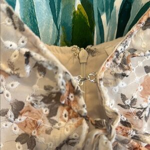 Elegant dress with a soft cream hue. Lacey floral pattern. Perfect for any occasion. Peephole cutout in center with bow tie. EUC.
