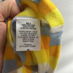 Orange, yellow, blue, and white vertical striped camisole. Adjustable length straps. V-neckline. Cropped length. Very soft viscose, nylon, polyester blend knit material. Size small. Non smoking home.