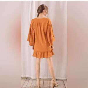 It also has 3/4 dolman bell sleeves, an oversize loose body, a yoke back, and a ruffled hem. 75% Rayon, 25% Nylon