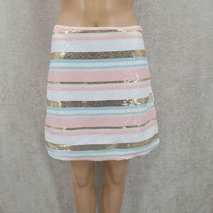 Shimmer in style with this chic striped sequin skirt. Featuring a blend of pink, gold, and white, it's perfect for any occasion. Pair it with your favorite top for a stunning look.