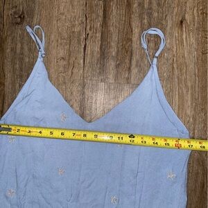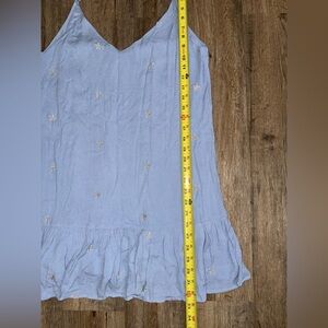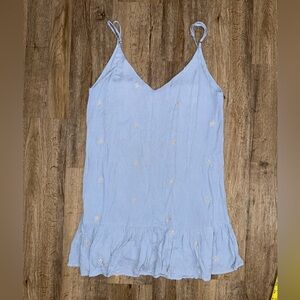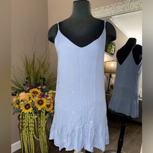 In like new condition. No issues. Light periwinkle blue with white stars. Adjustable straps. Ruffle hem.