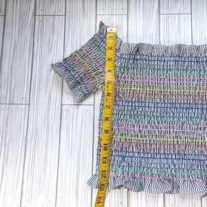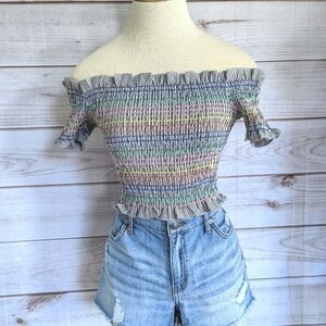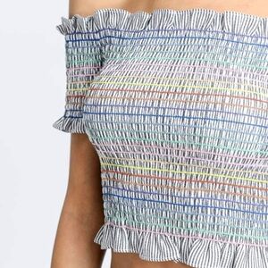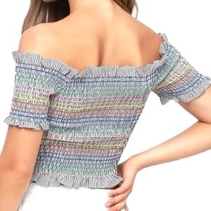 Storia Rainbow Striped Smocked Off the Shoulder Crop Top in Blue Stripe Sz Small