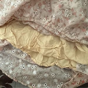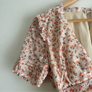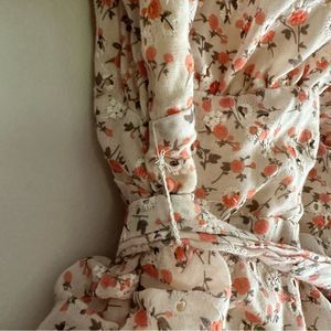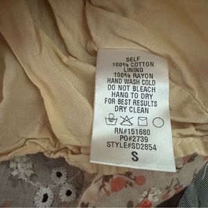 Storia dress with various frill details, short sleeves, and tie waist. V-neck. In excellent condition with no signs of wear, only flaw is one side of a belt loop is hanging on by a thread. Keyhole back. Hidden side zip. Cottagecore style