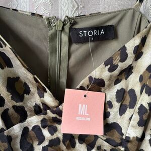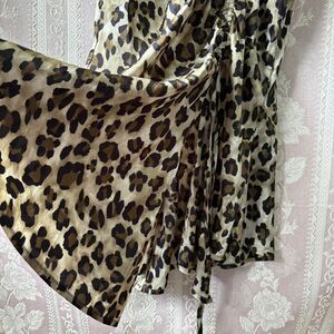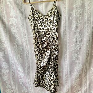 Sexy leopard print midi/maxi dress with ruching down one side of skirt that has a drawstring so you can control the ruching. Slit at bottom of ruching. Cami style top with adjustable straps. Zipper in back. Very soft. Brand is Storia, a LA brand, and NWT.