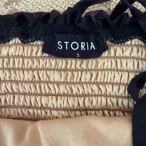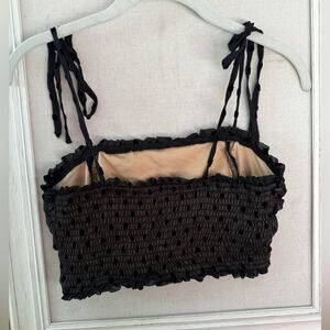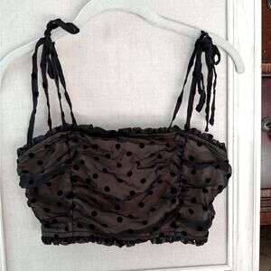 Storia taupe lined camisole top w elastic smocking detail. A black sheer tulle overlay with blacked flocked velvet polka dots. Ribbon tied straps with flocked velvet polka dots detail as well. Excellent condition with no rips stains or tears. Worn maybe twice. S