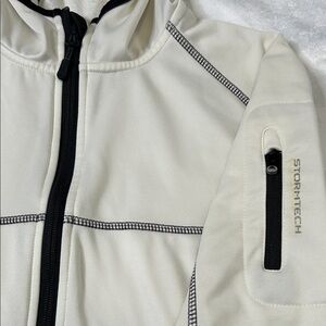 Elegant cream jacket by Storm. Features black accents and a cozy hood.
