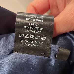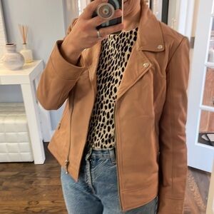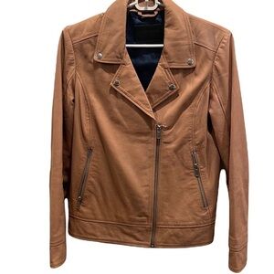 Caramel genuine leather jacket form Danish brand Storm & Marie. Silver hardware and navy blue lining. Zipper pockets at sides. Very good condition, a couple hard to notice discolorations at the back, see photo. Size XL but fits like a Medium.