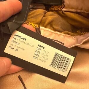 NWT but with runs and snags, pictured. Beautiful skirt that the picks and runs don't show much from a third person. Size 36 Euro which is about a 6 US. Polyester. No stretch. Zipper back.