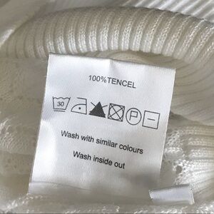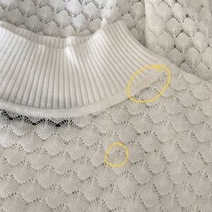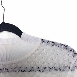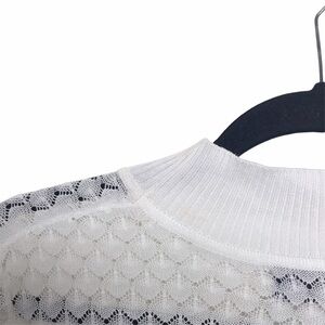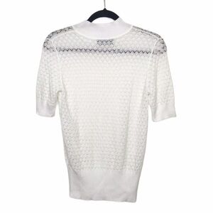 White, 100% tencel mock neck, cropped sleeve, short sleeve sweater. Has a see through open knit design. Preowned with some discoloration near neckline, shown in last photo. Otherwise in good shape. Has stretch.