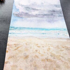 Watercolor depicts a large storm cloud rolling into view over the tranquil turquoise waves and surf of Sherwood Beach on O'ahu, Hawai'i. Note that the actual colors of the painting may appear differently on your screen vs in real life. I've included photos in two lights, a warm indirect sunlight and a cooler, cloudy sunlight at the end.
