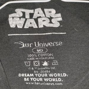 This is one black, Official Star Wars shirt. This shirt is black and features storm troopers on the front of the T-Shirt.