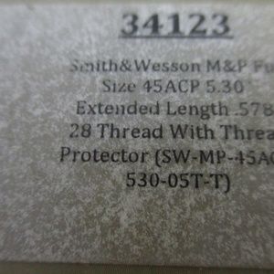 Description: StormLake Barrel for Smith&Wesson M&P 45ACP, 5.3" Threaded .578-28, Stainless. This barrel is machined from 416R stainless steel for superior strength, durability, and acccuracy. This barrel is hardened to 40-42 HRC and rifled to shoot jacketed or lead bullets. This match grade barrel is chambered for full case support. All StormLake Smith & Wesson M&P pistol barrels are drop in and will only occasionally require minor modification to fit. This barrel will fit the Smith and Wesson M&P in .45 ACP and is extended and threaded to support a suppressor. The barrel also comes with a thread protector.