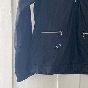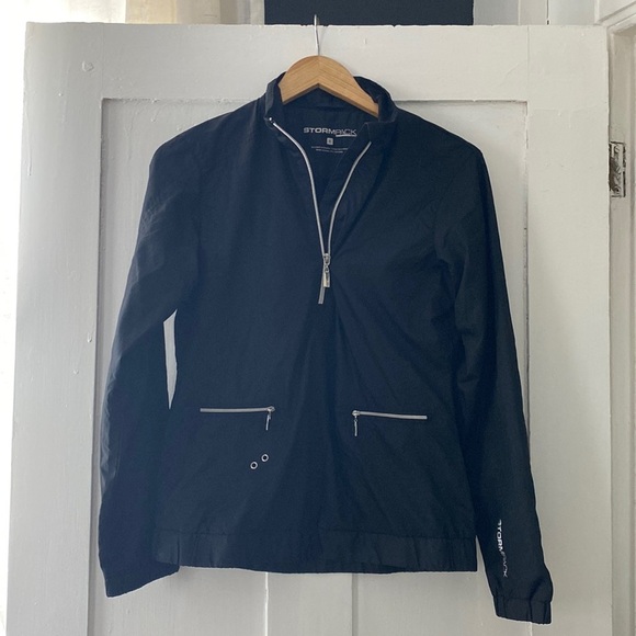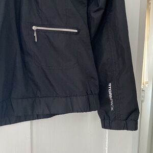 Excellent like new condition. Quarter zip pop over jacket from Stormpack. Black with silver zippers. Water and wind resistant. Women’s size small.