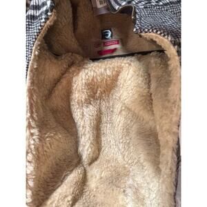 The Stormy Kromer Jacket for women in size L is a stylish and functional outerwear piece. Made from a wool blend with a Sherpa lining, this jacket offers warmth in the winter and fall seasons. The black and white plaid detail adds a touch of classic style, while features like metal front zipper, pockets, and logo accents add a modern flair. Hand wash only to maintain its quality.