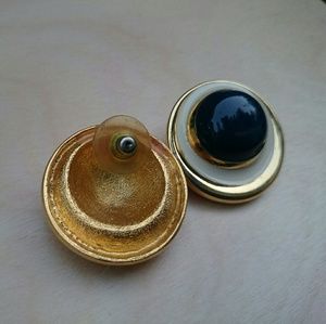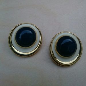 Vintage earrings that look, to me, like a frying egg, Sunny side-Up, except with a blue yolk instead! Royal blue orb outlined with gold, surrounded by pure white and framed in a thick gold band. The blue is very stunning in the sunlight🌄 Great for school colors!🏈🎓