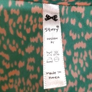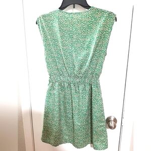 Cute Story dress in beautiful green and tan print, lightweight sheer fabric, perfect to wear under a green cardigan, size medium, no stains, great condition.