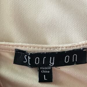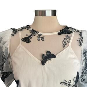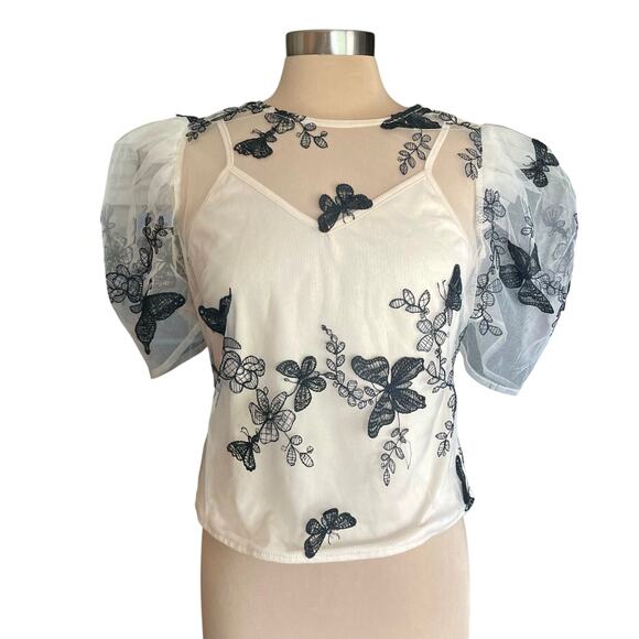 Story On Beige Tulle & Satin Butterfly Applique Puff Sleeve Top MEDIUM Fairy Cottage. Zipper back. Sheer tulle layer over attached satin cami. Perfect for adding a touch of whimsy to any outfit! This top is a size medium and in excellent condition.