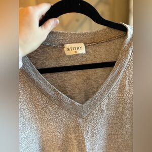 Brown v neck, dolman sleeve. Side hem slits. 67/33 rayon polyester. Super soft relaxed fit. Great with leggings. Great condition.