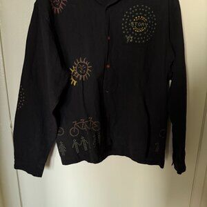- Jacket featuring hand embroidered design, long sleeves, boxy fit, buttons through front, and two front pockets.