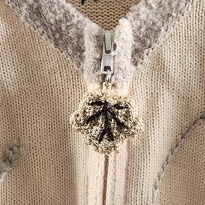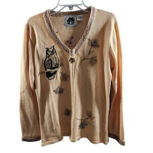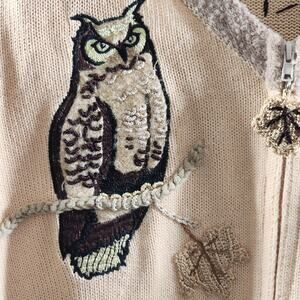 StoryBook Knits Sz L Peach AUTUMN GUARDIAN Fall OWL Maple Leaf Zipper Front Cardigan Sweater Trimmed Cuffs & Neckline