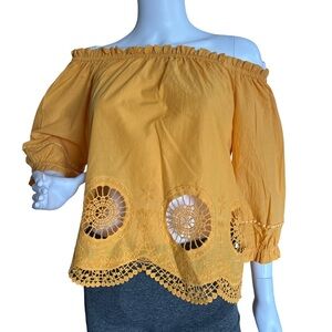 Brighten your wardrobe with this stylish off-shoulder yellow top. Perfect for casual outings, it features intricate lace detailing for a chic look.