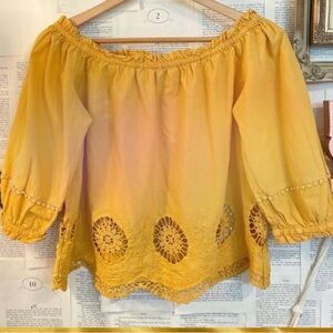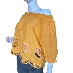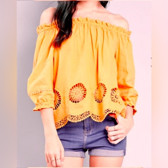 Brighten your wardrobe with this stylish off-shoulder yellow top. Perfect for casual outings, it features intricate lace detailing for a chic look.