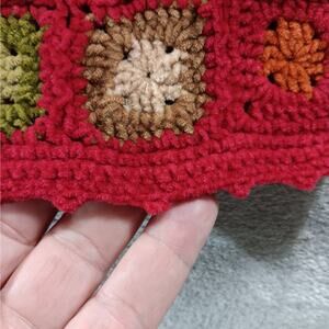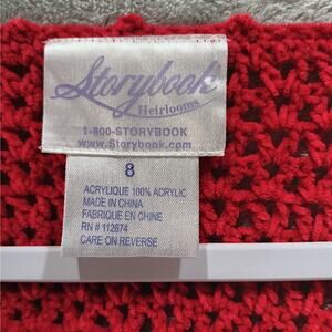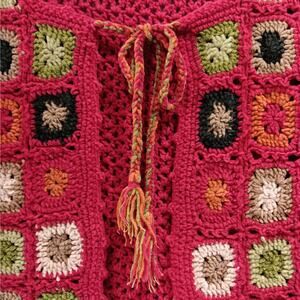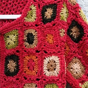 Storybook Heirlooms Granny Square Tie Front Cardigan Girl's Size 8. Red with multi-colored small granny squares. Ties at chest with braided yarn. Tassels at the bottom of tie. Preowned excellent condition. From a non-smoking home. See pics for measurements.