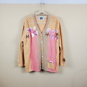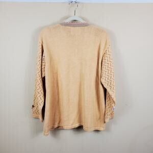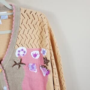 Gently used. Size 1X. Muted pastel colors. V-neck cardigan. Crochet detail on the sleeves. Crochet shell detail and button covers.