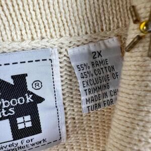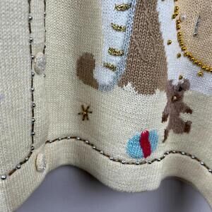 Whimsical Storybook Knits holiday cardigan, size 2X. Cream-colored knit with beaded Santa Claus, Christmas tree, and golden snowflakes throughout. Button-up with gold trim on collar and hem. Made of 55% ramie, 45% cotton. Ideal for Christmas parties or collectors of vintage festive wear. Bust: 27.5”, Length: 28.5”, Shoulder: 23”, Sleeve: 21.5”.