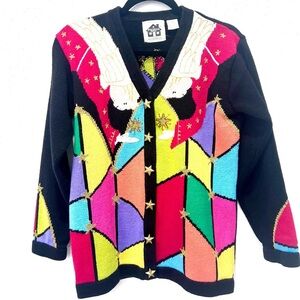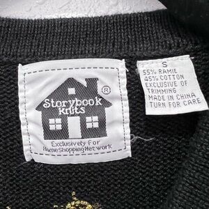 A vintage Storybook Knits cardigan, known for its unique and often embellished designs.