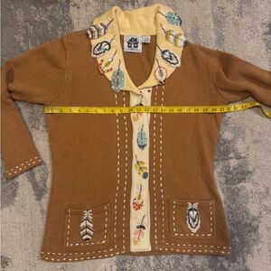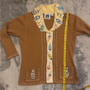 Discover the charm of the Storybook Knits jacket, featuring exquisite embroidery on a rich brown and cream palette. This piece combines elegance with a touch of western flair, making it a standout addition to any wardrobe. Perfect for those who appreciate detailed craftsmanship and timeless style.