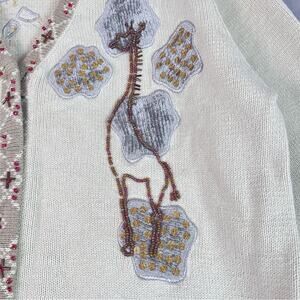 Storybook Knits Giraffe Theme Embellished Cardigan Sweater. Boxy fit, concealed buttons, beaded trim and giraffes And clouds made from beads and sequins front and back. Creamy ivory knit, made from ramie, cotton and acrylic.