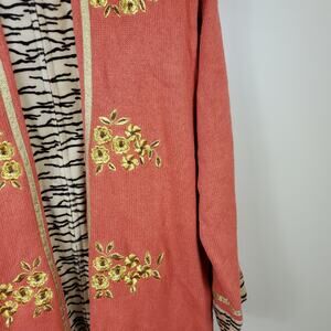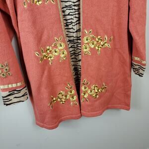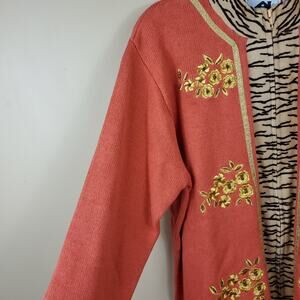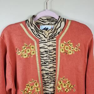 Gently used. Size 1X. Peach full zip sweater in a longer length. High neck. Zebra detail with gold embroidery.