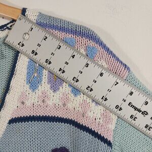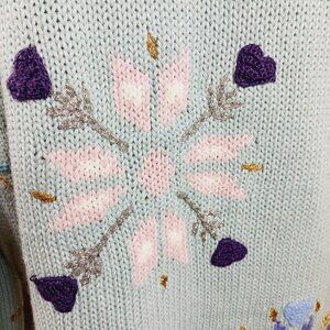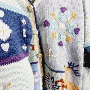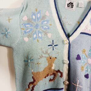 Storybook Knits Hand Knits Holiday Christmas Novelty Cardigan Size: Medium, Heavy Knit. Light Blue, Navy, White, Tan, soft Pink and Silver & Gold colors. This pre-loved cardigan is in very good condition and features: