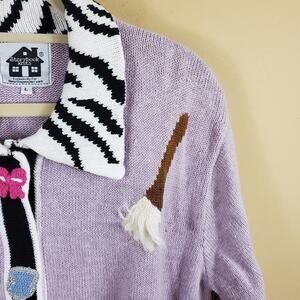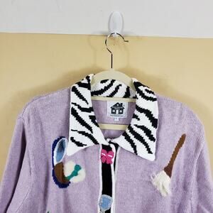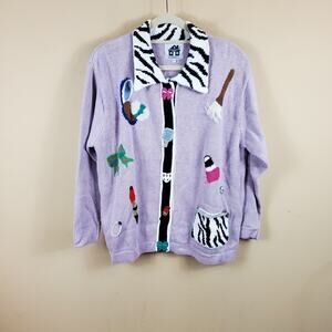 New with tags but has some flaws in the fabric, like picks. Please see photos. Size large. Long sleeve purple cardigan with zebra print collar. This cardigan is the perfect addition for a little girly flair. Features a makeup brush, makeup compact, lipstick, nail polish and a zebra purse that functions as a pocket!