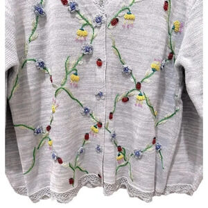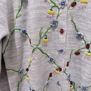This sweater is stunning with beautiful intricate lady bug details and floral details. Some buttons have flowers and others have ladybugs.