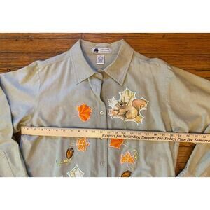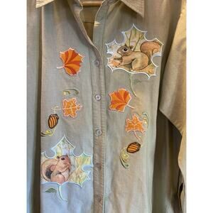 Storybook Pumpkin Fall Squirrel Applique Button Shirt Women’s Large