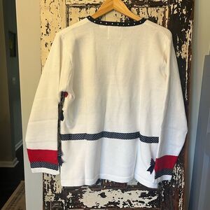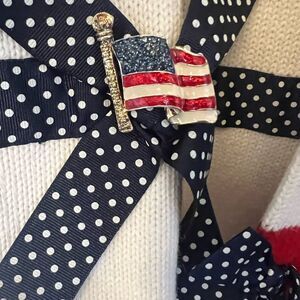 Elegant white cardigan with black trim. Features sparkling embellishments. American flag. From smoke free home. Measurements in photos. Bundle and save.