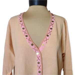 Storybook Knits Summer Gold Crochet Trim Peach Pink Cardigan Large
