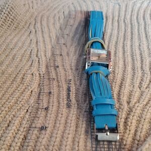 This stylish Strada watch features a rectangular silver-tone case and a multi-strand vibrant blue leather strap. The dial is minimalist, displaying the brand name Strada, "Quartz Japan" movement, and Roman numerals at the 12 and 6 o'clock positions.