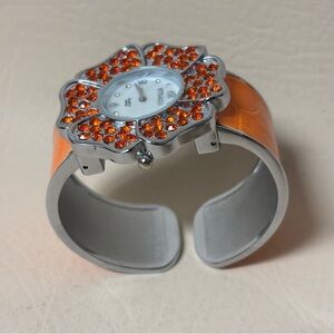 Strada Ladies Fashion Gem Quartz Watch Flower Silver Tone 2" Cuff Bracelet