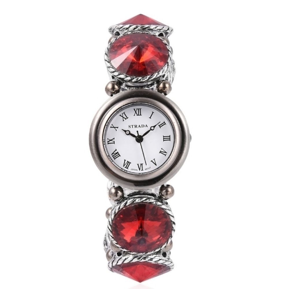 Strada Simulated Red Saphire Japanese Movement Silvertone Black Oxidized Water Resistant Bracelet Watch with Stainless Steel back.