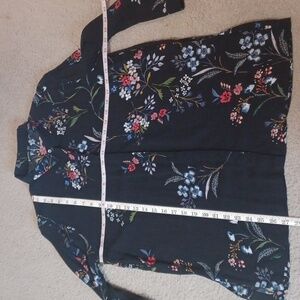 XL stradivarius 3/4 sleeve button up top. collar. hidden buttons. side slits. a longer design that might be considered a tunic. black with a delicate floral design. 100% viscose. soft and smooth with limited stretch. excellent pre-owned condition.