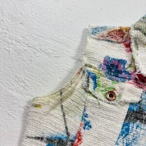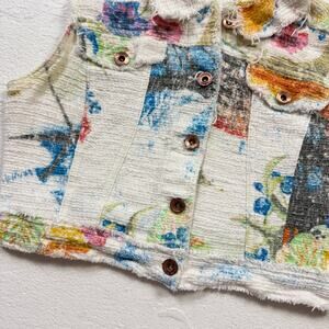 Stradivarius cropped vest with a unique colorful abstract floral design on cream fabric. Features button front closure, collared neckline, and raw frayed edges for a distressed, artsy look. Originally size L (youth?) but best fits a women’s size Small based on measurements. Perfect layered over tanks or dresses for a statement pop of color.