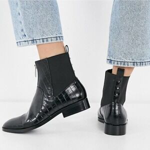 Key features: black faux croc, zipper on the top, stud detail on the back ankle, low block heel, pointed toe