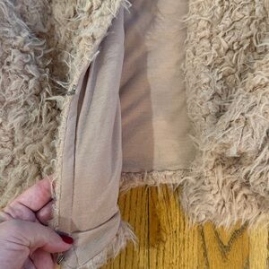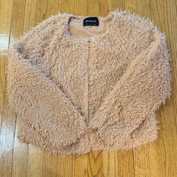 pink faux fur jacket • fuzzy teddy coat • Stradivarius jacket size large • blush pink winter coat • cozy sherpa-style jacket • glam cold weather outerwear • soft fuzzy cardigan jacket • girly neutral winter jacket
