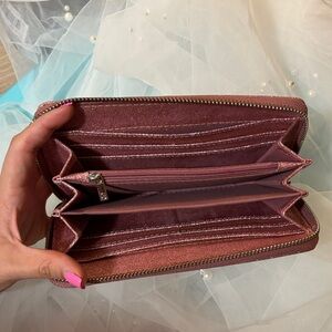 Shimmering pink wristlet with glitter finish. Ideal for evening events. Compact and chic design. Múltiple card slots and plenty space for cash or coins.